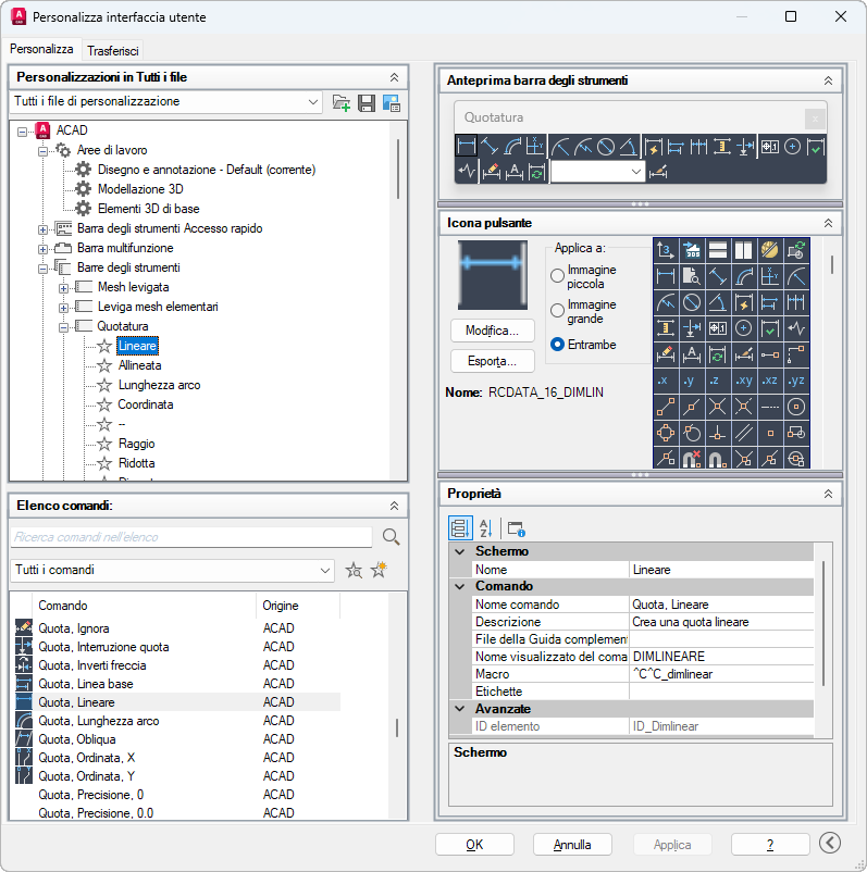 Fornisce un'interfaccia per la personalizzazione di aree di lavoro, barre degli strumenti, menu, gruppi della barra multifunzione, menu di scelta rapida e altri elementi dell'interfaccia utente.