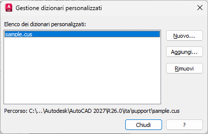 Consente d creare un dizionario personalizzato. Il nuovo dizionario viene evidenziato come dizionario corrente.