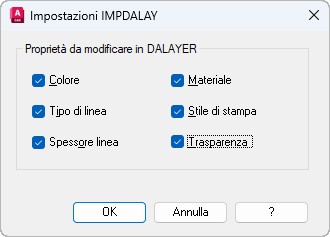 Imposta su DaLayer le modifiche locali di colore, tipo di linea, spessore di linea, materiale, stile di stampa e trasparenza per gli oggetti selezionati e i blocchi inseriti nei layer non bloccati.