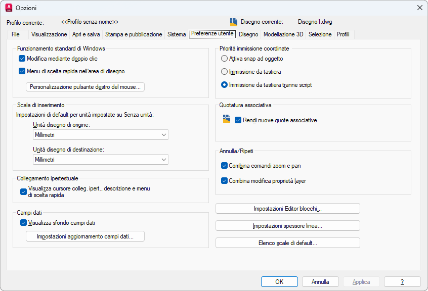 Controlla la scala di default per l'inserimento di blocchi e disegni in un disegno quando la scala di inserimento del disegno corrente è impostata su Senza unità.