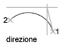 Inizia l'arco la cui tangente è orientata in una direzione specificata. Crea un arco di qualsiasi tipo, maggiore o minore, in senso orario o antiorario, a partire dal punto iniziale (1) fino al punto finale (2). La direzione è definita a partire dal punto iniziale.