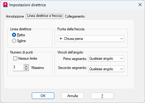 Nella finestra di dialogo Impostazioni direttrice sono incluse le seguenti schede: Annotazione, Linea direttrice e freccia e Collegamento
