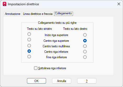 Consente di impostare la posizione in cui le direttrici vengono attaccate alle annotazioni di testo multilinea. Questa scheda è disponibile solo se è stato selezionato testoM nella scheda Collegamento.