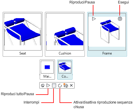 Dopo aver creato un'inquadratura, è possibile riprodurre l'animazione ad essa assegnata utilizzando i controlli vista situati sulle anteprime di ciascuna inquadratura o di ciascuna sequenza di inquadrature; in alternativa, è possibile utilizzare il controllo ShowMotion. Sono disponibili i seguenti controlli vista: