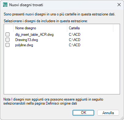 Al termine dell'estrazione, visualizza un elenco dei nuovi disegni aggiunti alla cartella selezionata per l'estrazione dati.