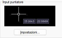 Quando l'input puntatore (cursore) è attivo e un comando è in esecuzione, la posizione delle coordinate dei puntatori a croce viene visualizzata nelle caselle di immissione della descrizione comando in prossimità del cursore. È possibile immettere le coordinate nella descrizione comando anziché alla riga di comando.