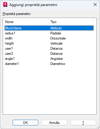 Visualizza il nome dei parametri che è possibile aggiungere alla tabella proprietà del blocco.