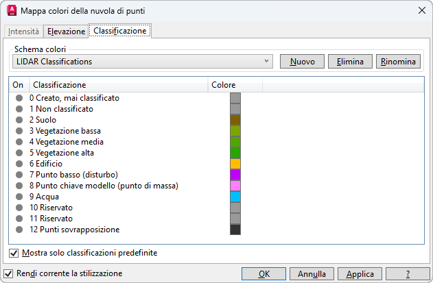 Modifica le impostazioni dello schema di colori per la stilizzazione della nuvola di punti di tipo Classificazione.