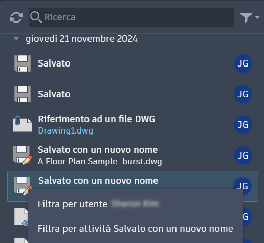 È inoltre possibile accedere facilmente ai filtri facendo clic con il pulsante destro del mouse su qualsiasi attività. Questa azione consente di filtrare i dati in base all'utente che ha eseguito l'attività o in base allo stesso tipo di attività.