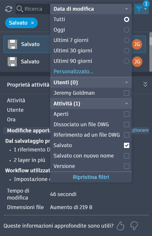 Selezionando Salvato nel filtro delle attività, è possibile isolare l'attività della versione. Per filtrare ulteriormente i dati, utilizzare i filtri Ora e Utenti.