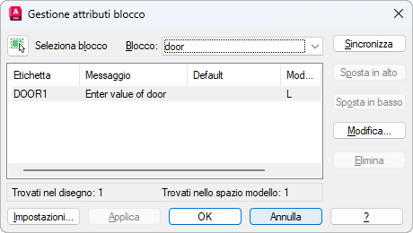 Gli attributi del blocco selezionato vengono visualizzati nell'elenco degli attributi. Per default, nell'elenco degli attributi vengono visualizzate le proprietà di attributo Etichetta, Messaggio, Default, Modalità e Annotativo. Per ciascun blocco selezionato, una descrizione che segue l'elenco degli attributi identifica il numero delle sue istanze nel disegno e nel layout corrente.