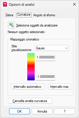 Calcola gli intervalli minimo e massimo di tutti gli oggetti selezionati per l'analisi della curvatura. (Variabili di sistema VSACURVATUREHIGH e VSACURVATURELOW)