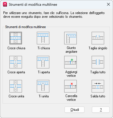 Nella finestra di dialogo vengono visualizzati strumenti contenenti immagini di esempio in quattro colonne. La prima colonna controlla le multilinee che si intersecano, la seconda quelle che formano una ti, la terza controlla vertici e giunti angolari e infine la quarta controlla interruzioni in multilinee.