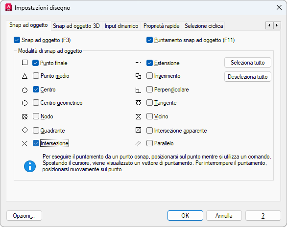 Nota: La scheda Snap a oggetto 3D non è disponibile in AutoCAD LT.