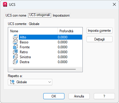 Elenca i sei sistemi di coordinate ortogonali del disegno corrente. I sistemi di coordinate ortogonali vengono definiti rispetto al sistema UCS specificato nell'elenco Rispetto a.