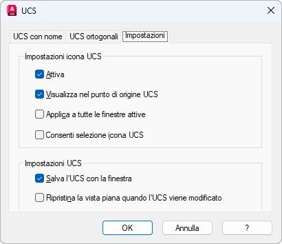 Visualizza e modifica le impostazioni dell'icona e del sistema UCS salvate con una finestra.