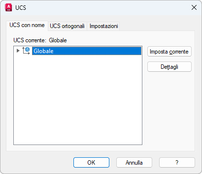 Visualizza la finestra di dialogo Dettagli UCS, in cui sono visualizzati i dati sulle coordinate UCS. Per visualizzare i dettagli relativi ad un UCS selezionato, è anche possibile fare clic con il pulsante destro del mouse, quindi scegliere Dettagli dal menu di scelta rapida.
