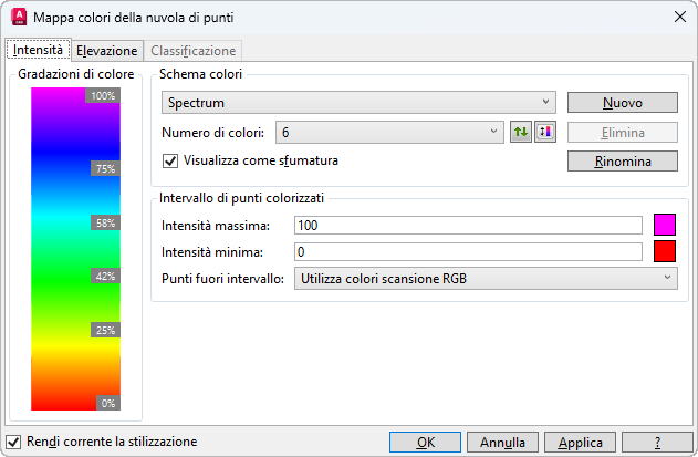 Nota: Le stilizzazioni di tipo Intensità, Elevazione e Classificazione si basano sugli schemi di colori assegnati nella finestra di dialogo Mappa colori della nuvola di punti (comando MAPPACOLORINUVPUNTI). Se i dati richiesti non sono disponibili nella nuvola di punti, nel menu a discesa delle stilizzazioni questa opzione risulta disattivata.