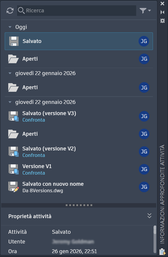 Informazioni approfondite attività consente di registrare gli aggiornamenti ad un file di disegno apportati da ciascun collaboratore, semplificando la collaborazione e aiutando a riprendere facilmente da dove si era interrotto.