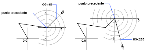 Per specificare le coordinate relative, anteporle il simbolo @. Ad esempio, digitando @1<45, si specifica un punto situato ad una distanza di 1 unità dall'ultimo punto specificato e con un'angolazione di 45 gradi rispetto all'asse X.