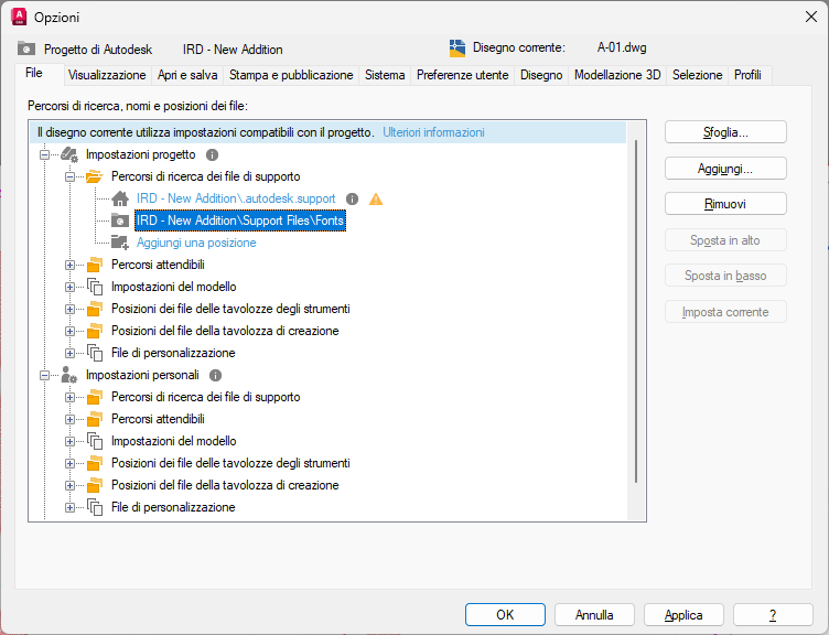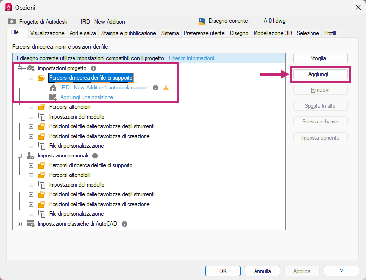 - È possibile modificare le impostazioni dei percorsi nei nodi Impostazioni personali e Impostazioni classiche di AutoCAD.