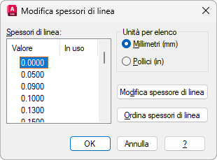 Specifica le unità utilizzate per visualizzare l'elenco degli spessori di linea,