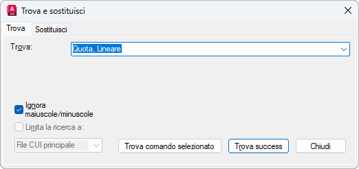 Individua una stringa di ricerca nei comandi o nelle proprietà dei comandi disponibili nei riquadri Elenco comandi o Personalizzazioni in <nome file>, o sostituisce una stringa di ricerca con una nuova stringa.