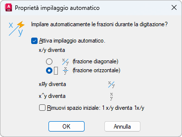 TESTOM (comando) Trova: selezionare una frazione impilata nell'editor di modifica diretta del testo > > Proprietà impilaggio > Impilaggio automatico