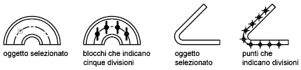 - Specificare un numero di distanze uguali tra i punti o i blocchi di un oggetto selezionato (comando DIVIDI)