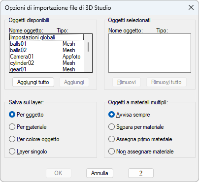 Crea un layer per ciascun oggetto nel file 3D Studio e posiziona l'oggetto su tale layer. Il nome del layer corrisponde a quello dell'oggetto.