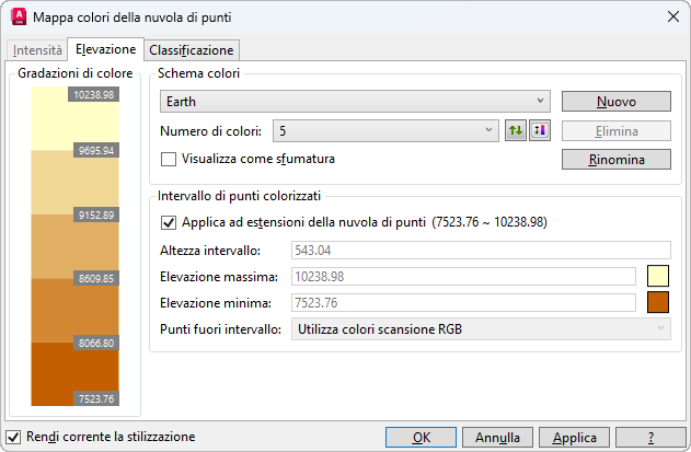 Le stilizzazioni di tipo Intensità, Elevazione e Classificazione assegnano i colori ad una nuvola di punti in base ai dati dei punti pertinenti nella nuvola. È possibile scegliere schemi di colori predefiniti, quali "Spettro" o "Terra", oppure creare schemi personalizzati. È possibile assegnare lo stesso schema di colori per Intensità ed Elevazione oppure assegnare uno schema diverso per ciascun tipo di stilizzazione. Per Classificazione è previsto un insieme di schemi separato.