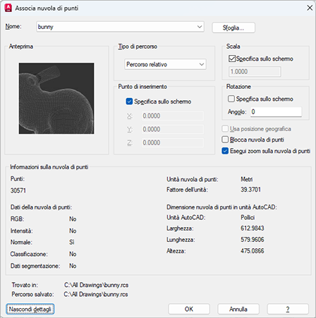 Nella finestra di dialogo Associa nuvola di punti, specificare le preferenze per punto di inserimento, scala e rotazione.