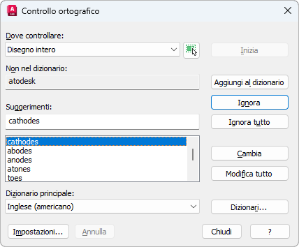 Controlla l'ortografia del testo a riga singola, multilinea o multidirettrice, nonché del testo all'interno di attributi di blocco e di riferimenti esterni o aggiunti alle quote