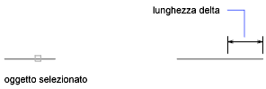 Modifica la lunghezza di un oggetto in base ad un incremento specificato, corrispondente alla distanza tra il punto finale più vicino e il punto di selezione. Inoltre, Delta modifica l'angolo di un arco in base ad un incremento specificato, corrispondente alla distanza tra il punto finale più vicino e il punto di selezione. Un valore positivo estende l'oggetto, un valore negativo lo taglia.