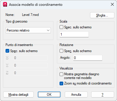 Individua, inserisce, assegna il nome e definisce i parametri e i dettagli dei modelli di coordinamento associati, ad esempio i file NWD e NWC di Navisworks.