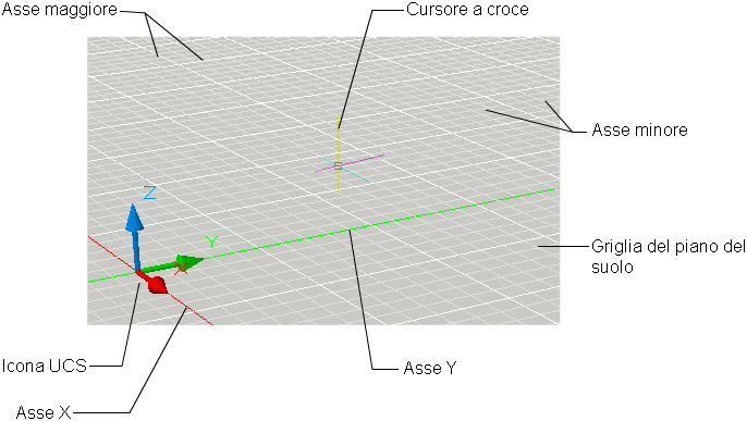 - Griglia del piano del suolo. Quando la proiezione prospettica è attivata, la griglia viene visualizzata come una griglia del piano del suolo. I colori sono impostati per le linee di griglia principali e secondarie e le linee d'asse.