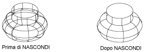 Se la variabile di sistema DISPSILH è attivata, il comando NASCONDI visualizza oggetti superficie e solido 3D con spigoli della sagoma e sopprime la visualizzazione delle sfaccettature. Gli oggetti mesh 3D non vengono influenzati.