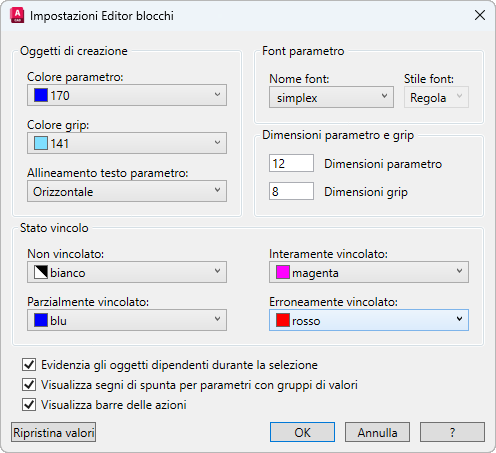 Consente di modificare le impostazioni di colore, testo, grip e vincolo, oltre ad altre impostazioni di visualizzazione, dell'Editor blocchi.
