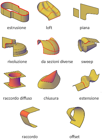 Per creare i modelli di superficie, è possibile utilizzare molti degli stessi strumenti utilizzati per i modelli solidi, ossia sweep, loft, estrusione e rivoluzione. È inoltre possibile creare superfici eseguendo il raccordo diffuso, chiudendo ed estendendo altre superfici.