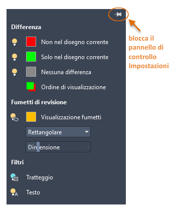 Il pannello Impostazioni controlla quali tipi di differenze visualizzare, i fumetti di revisione, se vengono visualizzati oggetti di tratteggio o di testo e quali colori vengono utilizzati. Per modifiche frequenti, è possibile bloccare il pannello Impostazioni per un comodo accesso. Per maggiore chiarezza, nell'immagine che segue sono stati utilizzati colori per i daltonici.