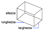 Crea un parallelepipedo con la lunghezza, la larghezza e l'altezza specificate. La lunghezza corrisponde all'asse X, la larghezza all'asse Y e l'altezza all'asse Z.