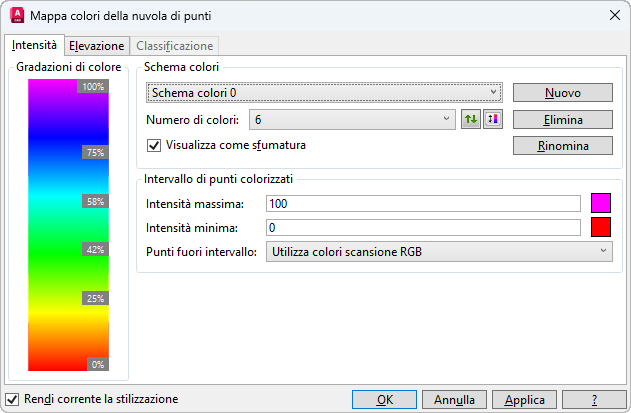 Modifica le impostazioni dello schema di colori per la stilizzazione della nuvola di punti di tipo Intensità.