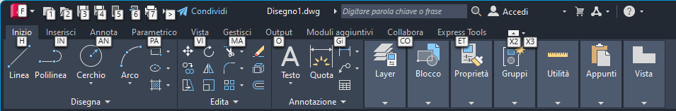 È possibile utilizzare i tasti anziché il dispositivo di puntamento per effettuare selezioni nei menu, sulla barra degli strumenti Accesso rapido e sulle barre multifunzione. Per verificare i tasti disponibili nell'area di lavoro corrente, premere ALT.