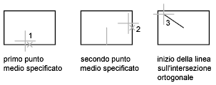 Ad esempio, è possibile trovare il centro di un rettangolo senza usare le linee di costruzione. Avviare il puntamento e specificare il punto medio di una linea orizzontale. Trascinare verticalmente il cursore e specificare il punto medio di una linea verticale (2). Premere INVIO per accettare il punto (3) al centro del rettangolo.