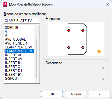 Visualizza un'anteprima della definizione di blocco selezionata. Un'icona che rappresenta un fulmine indica che si tratta di un blocco dinamico.