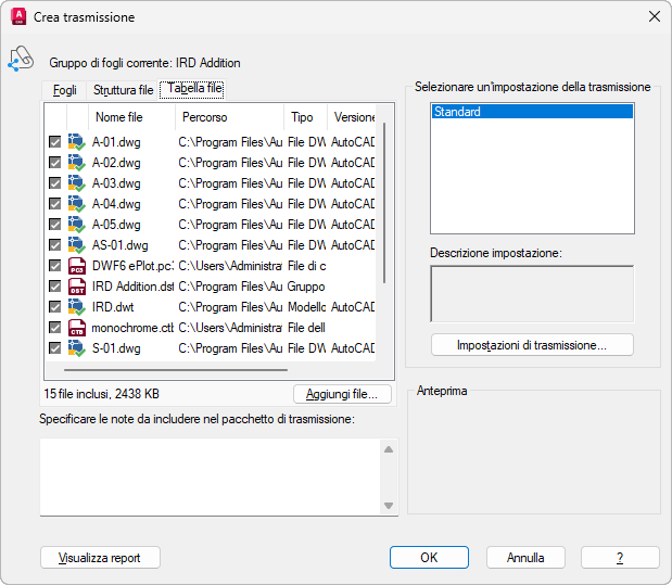 Per default, vengono elencati tutti i file associati al disegno corrente (quali rimandi, stili di stampa e font correlati). È possibile aggiungere altri file al pacchetto di trasmissione o rimuovere quelli esistenti. I file correlati a cui viene fatto riferimento tramite URL non vengono inclusi nel pacchetto di trasmissione.