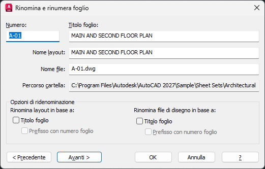 Carica il foglio successivo in questa finestra di dialogo. Questa opzione consente di assegnare nuovi numeri e titoli ad una serie di fogli.