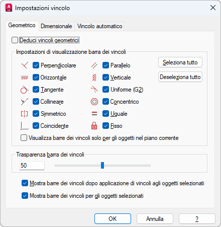 Controlla la visualizzazione dei vincoli nelle barre dei vincoli.