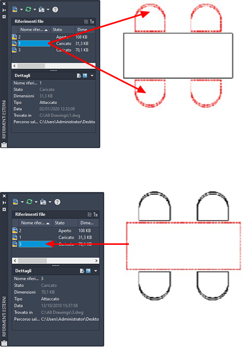 Per individuare un riferimento esterno in un disegno complesso, selezionare un elemento nella tavolozza Gestione riferimenti per evidenziare tutte le istanze visibili nel disegno. Viceversa, selezionare un riferimento esterno nel disegno per evidenziarne il nome nella tavolozza Gestione riferimenti.