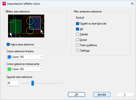 Controlla la trasparenza dell'area di selezione durante la selezione finestra e intersecante. (Variabile di sistema SELECTIONAREAOPACITY)